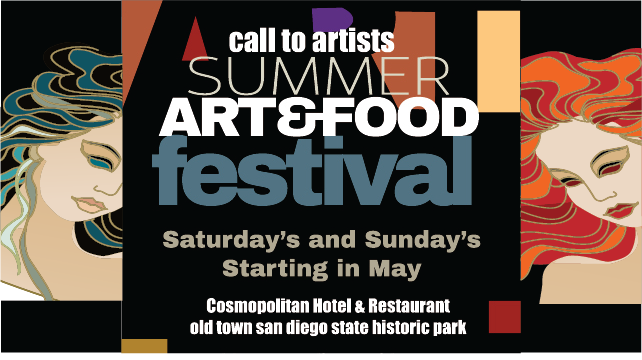 This year at the Cinco de Mayo event in Old Town will launch the first ever Summer Art & Food Fest at the Cosmopolitan Hotel. The garden will host the artworks from several local renowned artist and display a buffet of food that is an art of its own. Music and libations served up in an amazing atmosphere. The Cosmopolitan Hotel is an 18th century renovation where early San Diego residents found themselves enjoying the company of their friends and neighbors over a glass of wine or whisky on the rocks. To find out more, click on ad, to get an artist application, you will be directed to the www.oldtownsandiegoguide.com